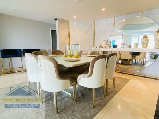 Este penthouse está amoblado y cuenta con detalles como aire acondicionado, una cocina equipada con electrodomésticos de última generación. La habitación principal también incluye un baño completo, clósets de diseño, jacuzzi, turco, piscina climatizada con 2 cascadas, bar discoteca, cuarto del servicio, PH totalmente domotizado